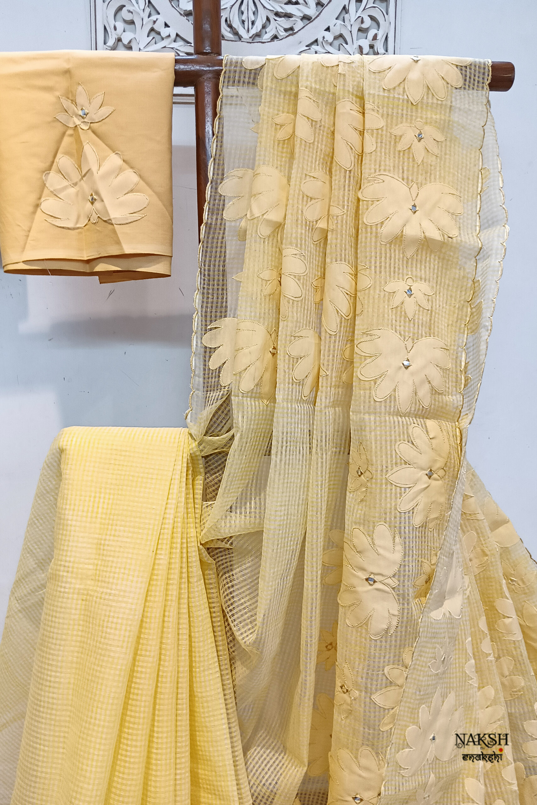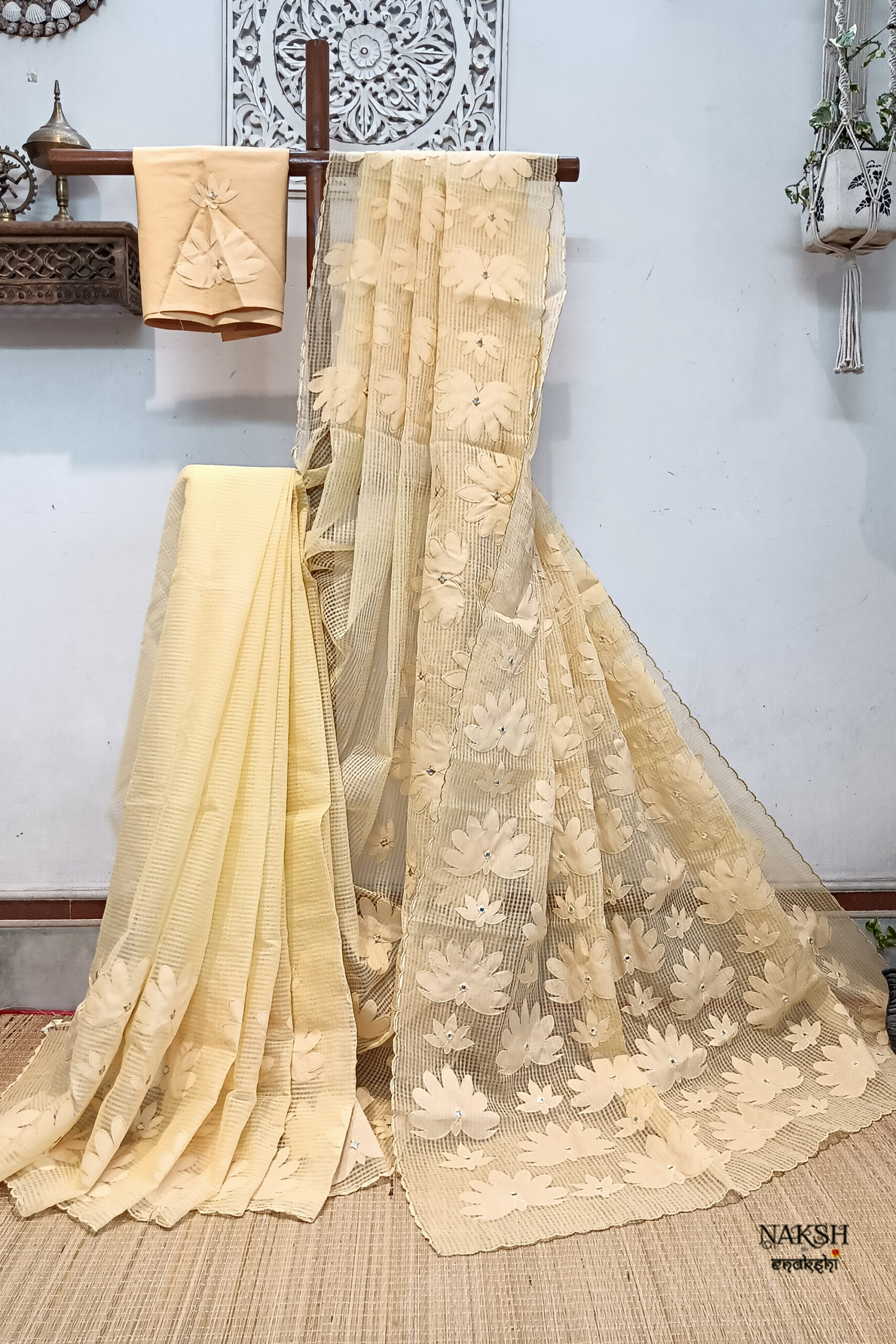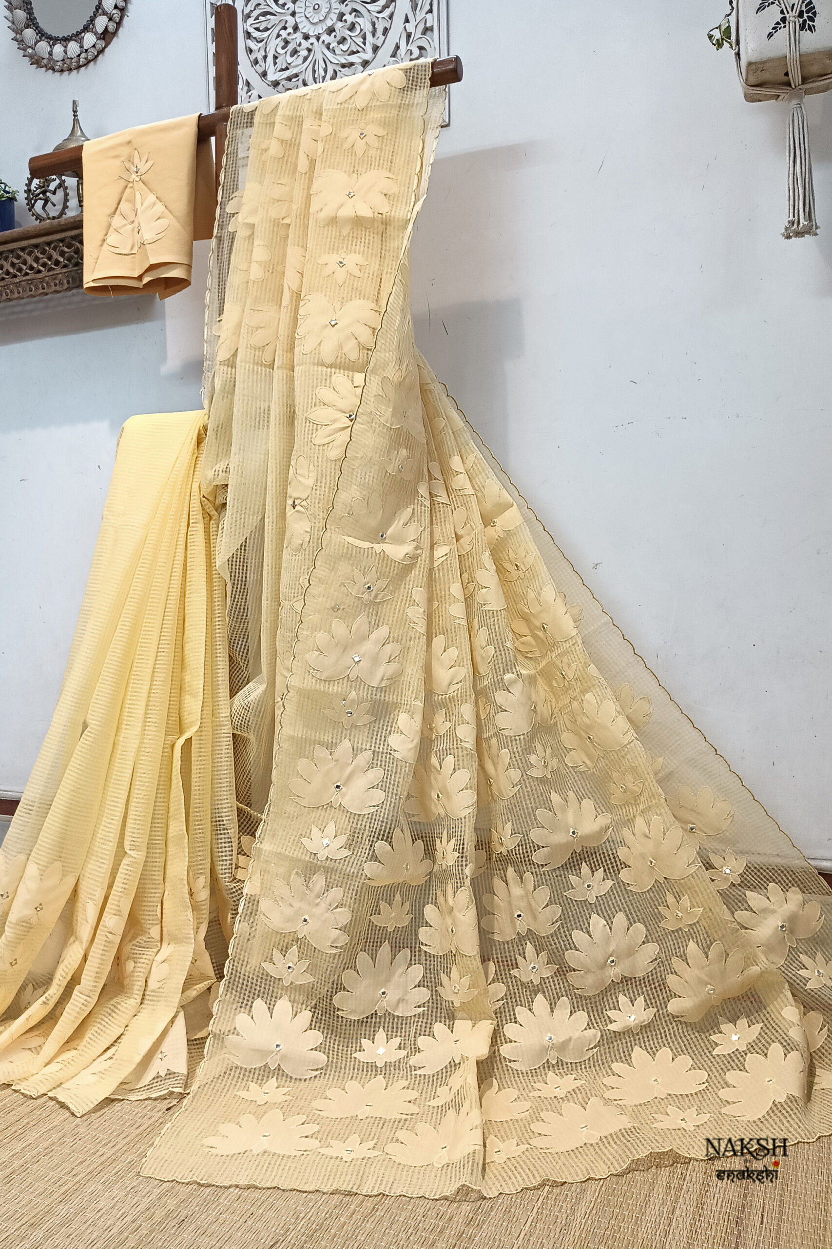Handloom resham checks saree with applique work. Elevate your ethnic wardrobe with this exquisite Handloom Resham Checks Saree in a graceful yellowish beige shade. Crafted from a dual-color resham-by-cotton fabric, this saree is lightweight, breathable, and easy to drape, making it a perfect choice for all-day comfort. The saree features lotus applique work in a beige color design, enhanced with a subtle touch of tiny mirrors that add just the right amount of sparkle. The scalloped border along the edges lends a refined and stylish finish.