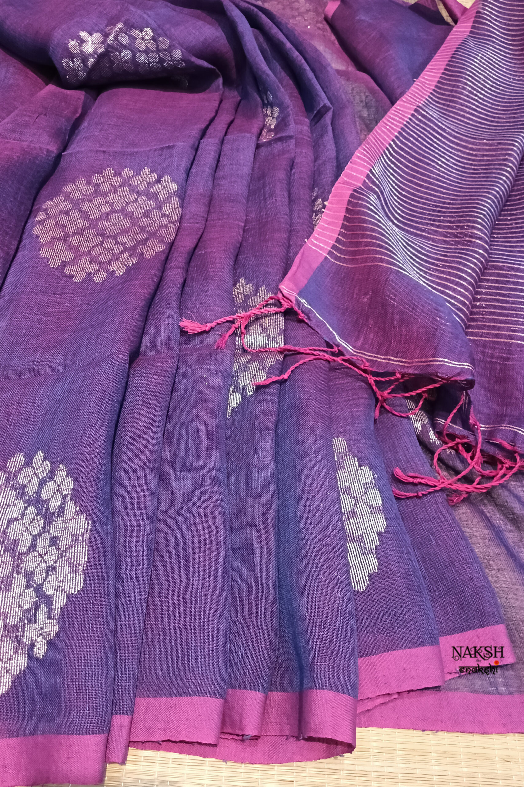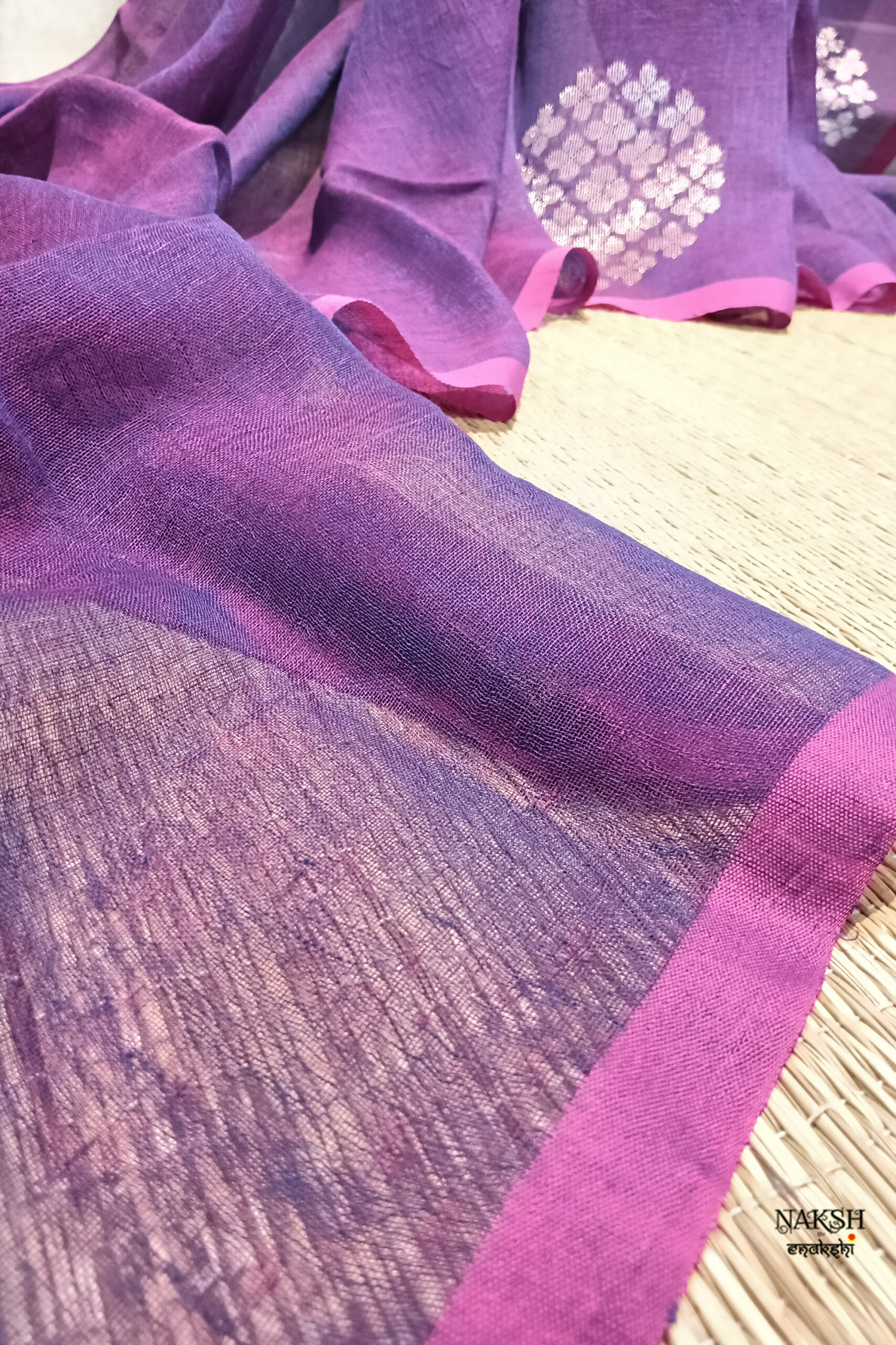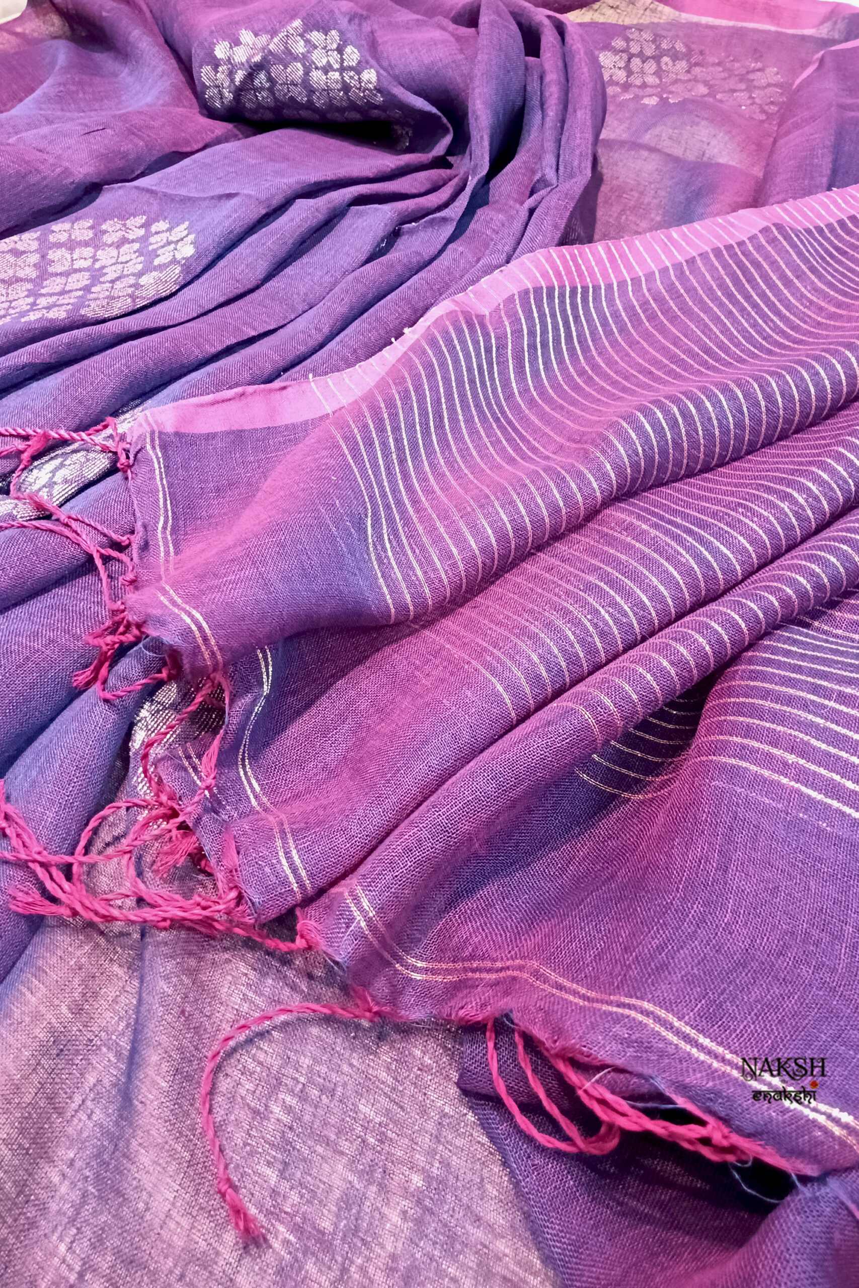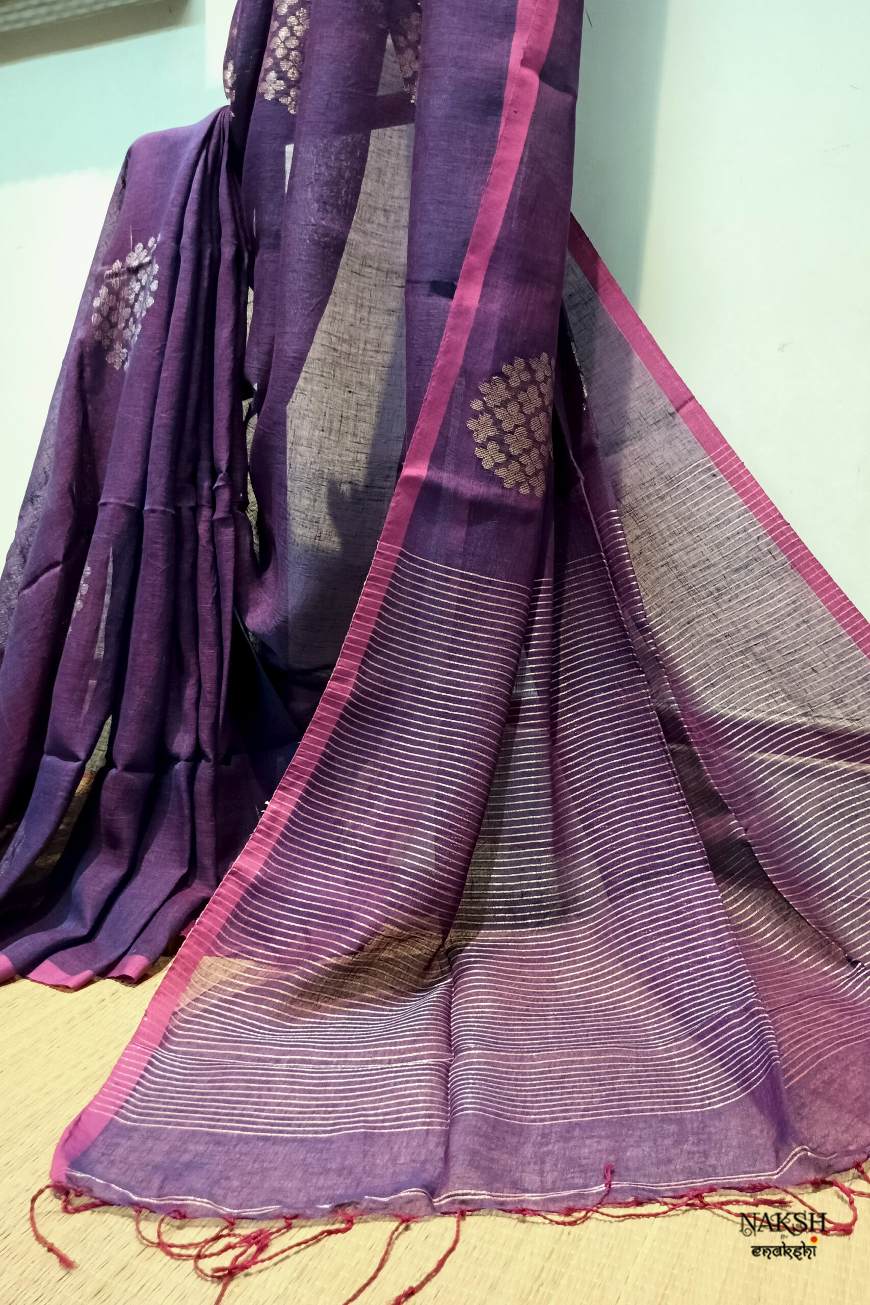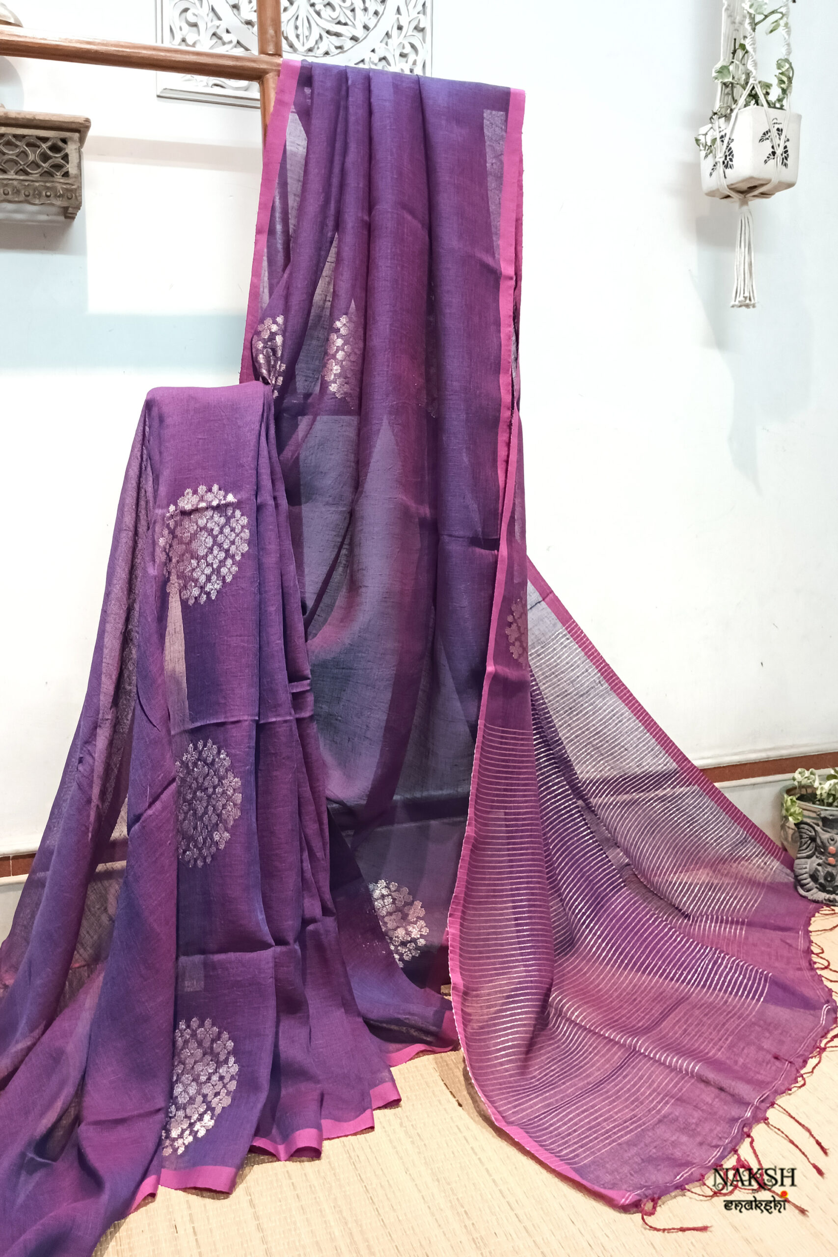 Handwoven linen jamdani saree in a dual tone of rani and purple color. Discover the captivating allure of this linen saree, intricately handwoven with exquisite jamdani work and embellished with tested zari. Crafted from organic, breathable, and sustainable fabric, this saree is a perfect companion for the summer season. Its versatility allows you to style it effortlessly.