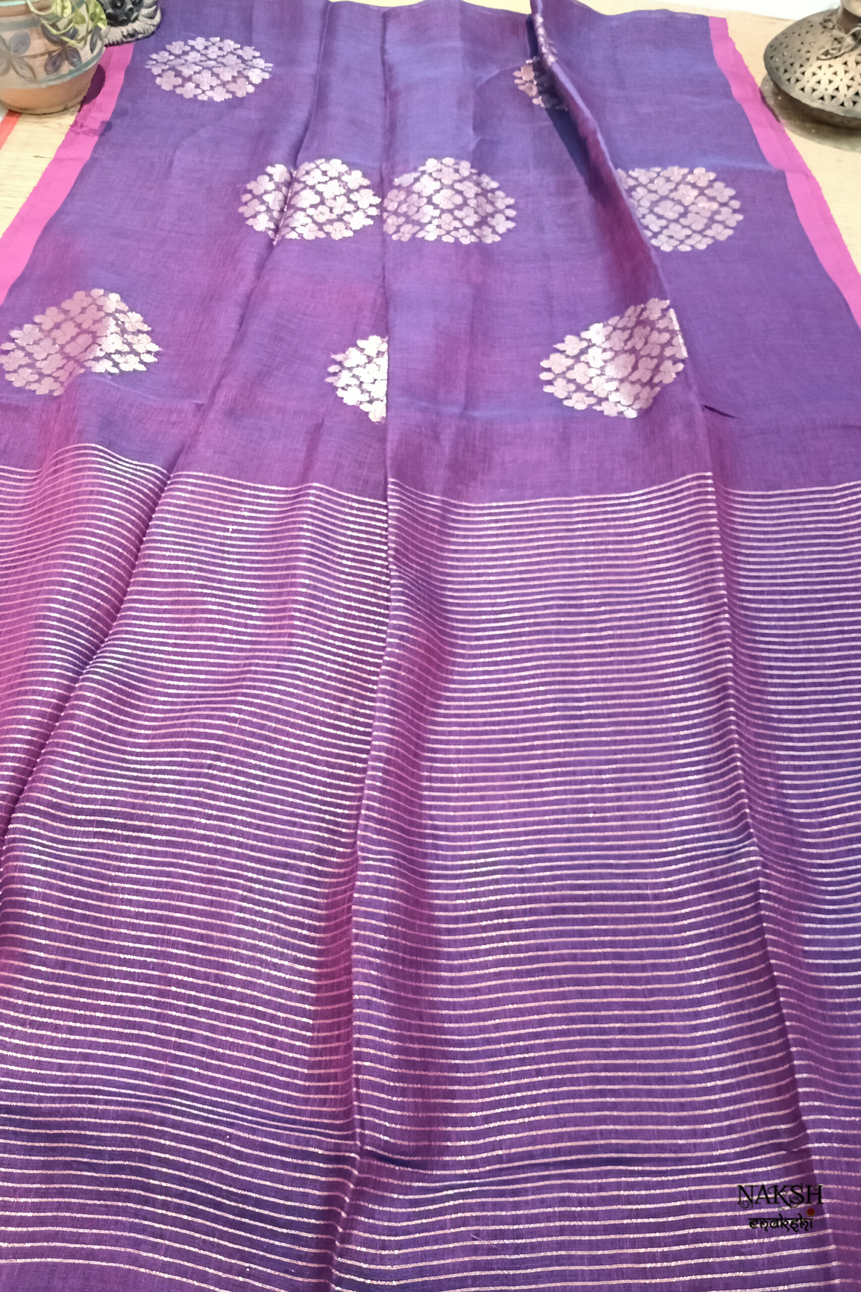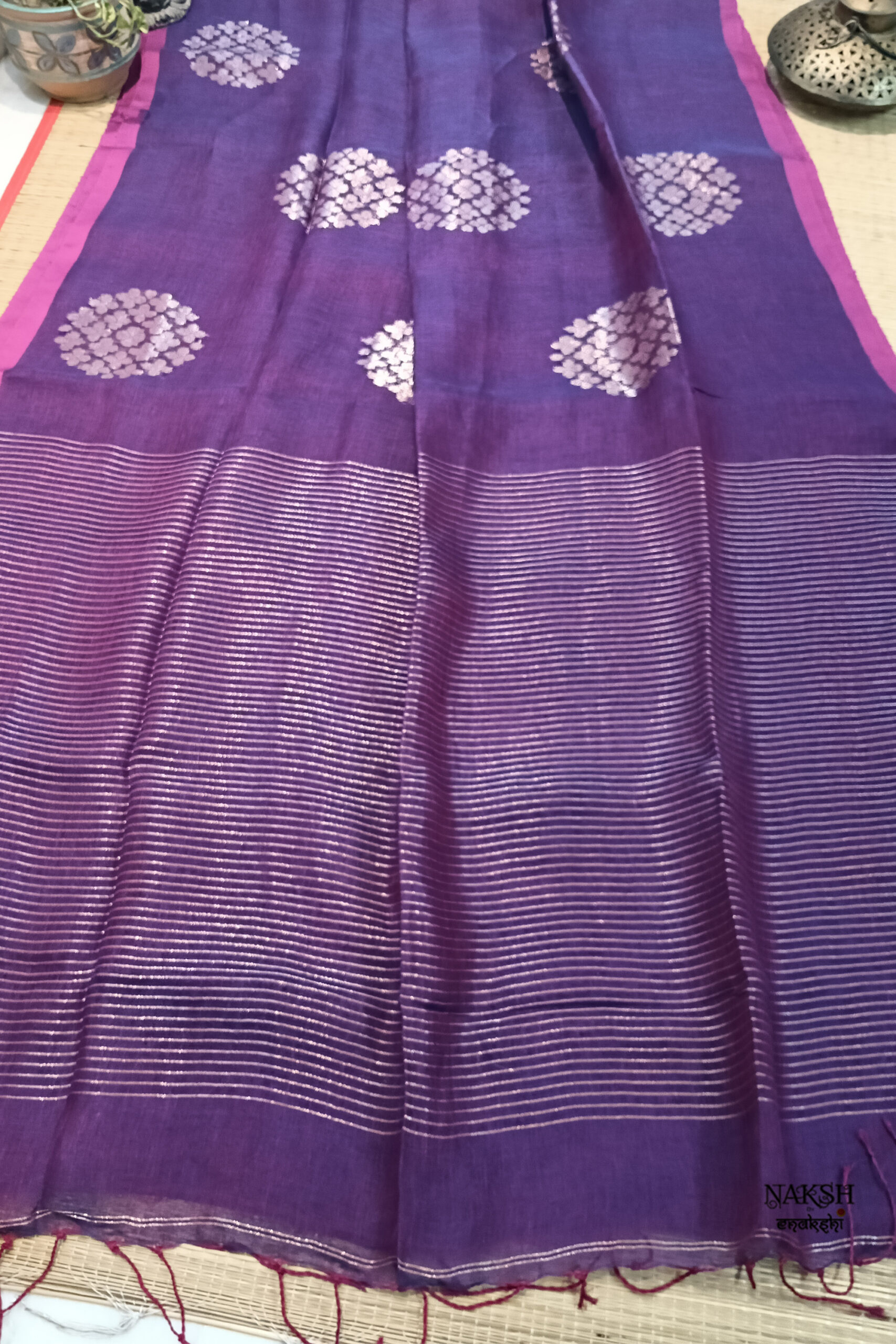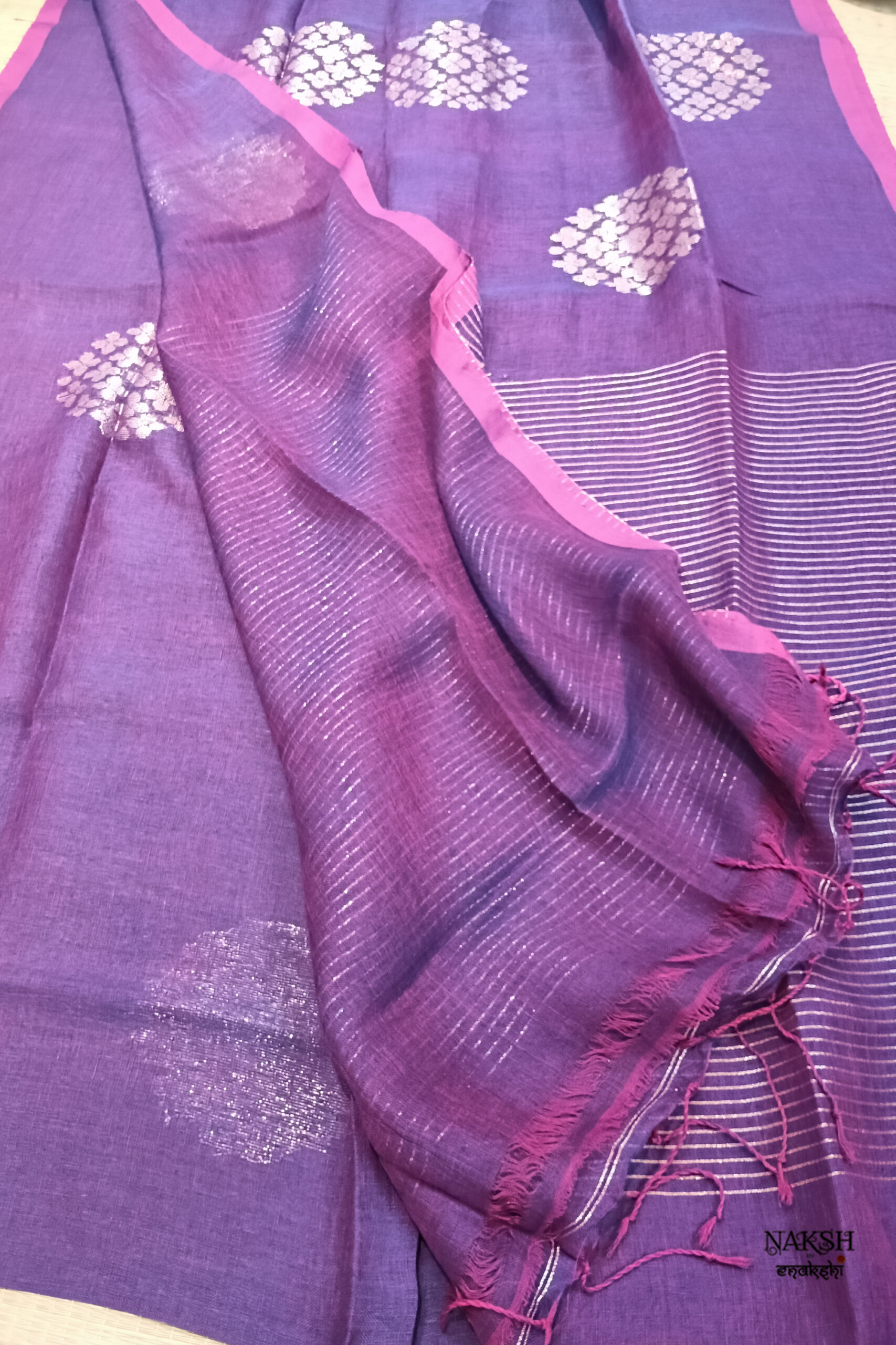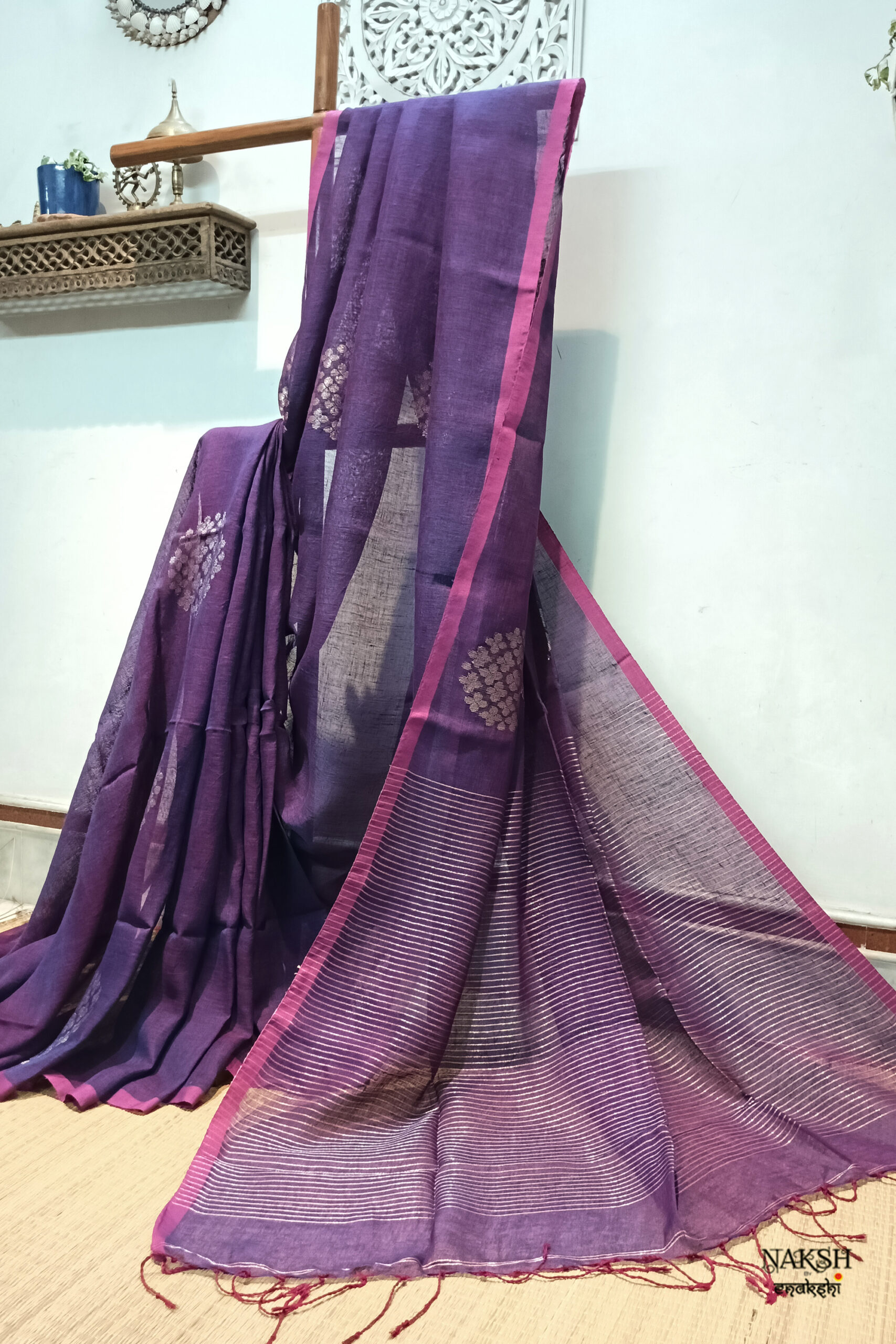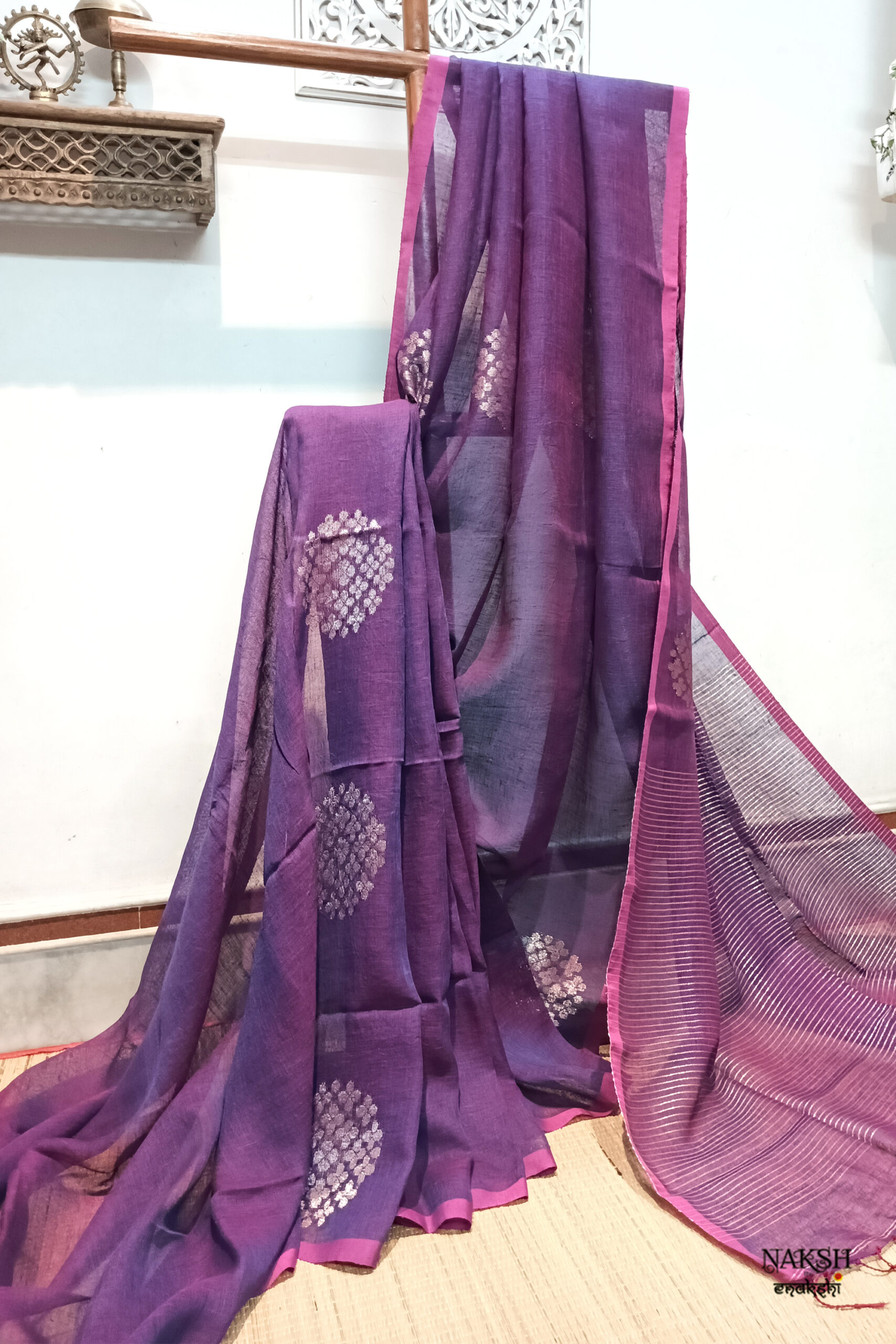 Handwoven linen jamdani saree in a dual tone of rani and purple color. Discover the captivating allure of this linen saree, intricately handwoven with exquisite jamdani work and embellished with tested zari. Crafted from organic, breathable, and sustainable fabric, this saree is a perfect companion for the summer season. Its versatility allows you to style it effortlessly.