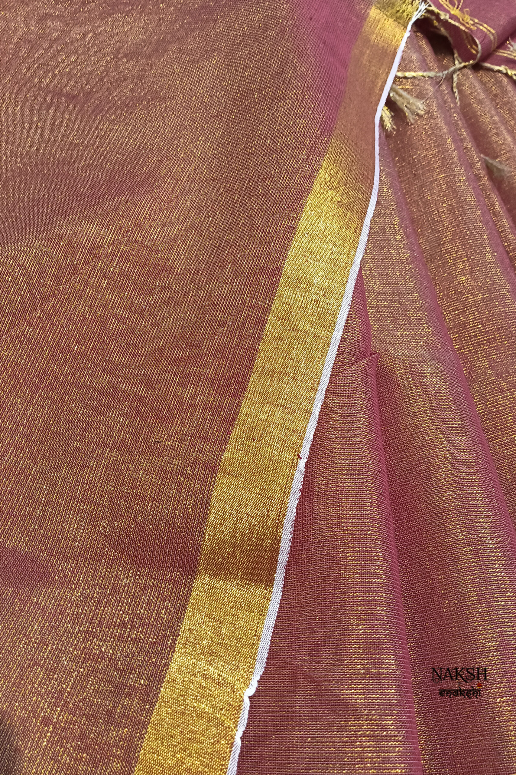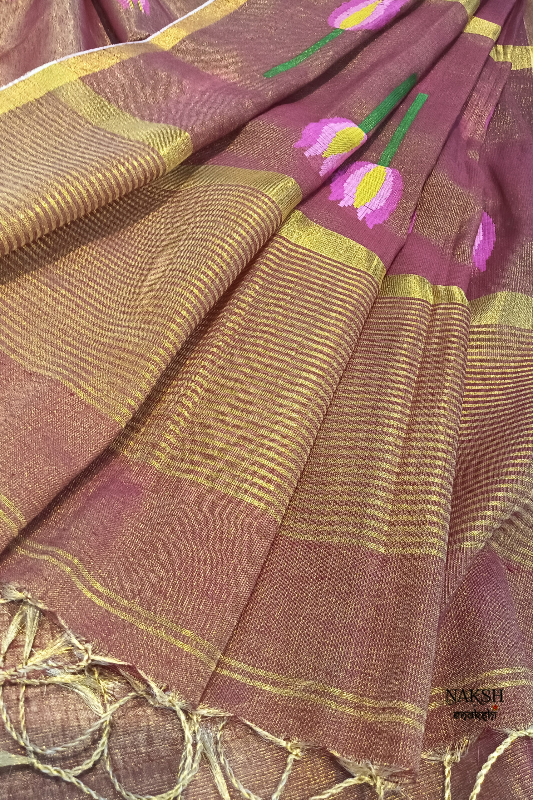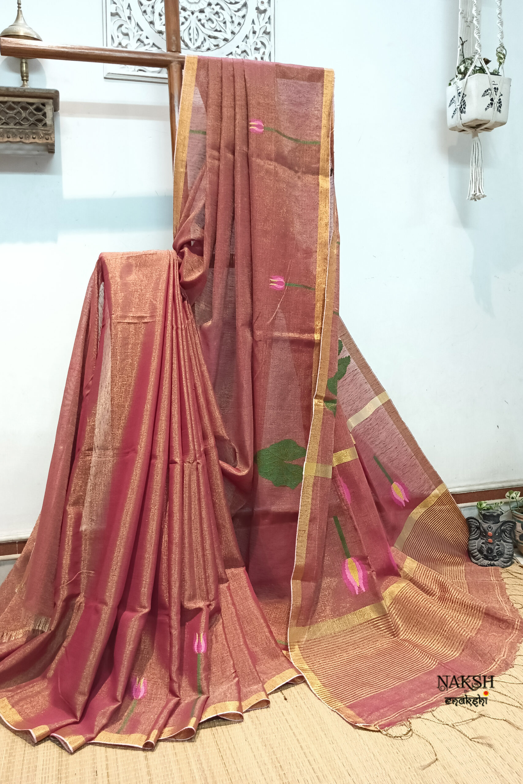 Handwoven tissue linen jamdani saree wirh blouse piece. This elegant tissue linen Jamdani saree comes in a rich brown shade with a subtle tested zari sheen. The tana uses fine tested tissue yarn, while the bana blends cotton and linen for a soft yet structured texture. Skilled artisans handweave delicate Jamdani motifs inspired by lotus and leaves, adding refined beauty. The fabric glows gently, giving the saree a graceful and luxurious appeal.