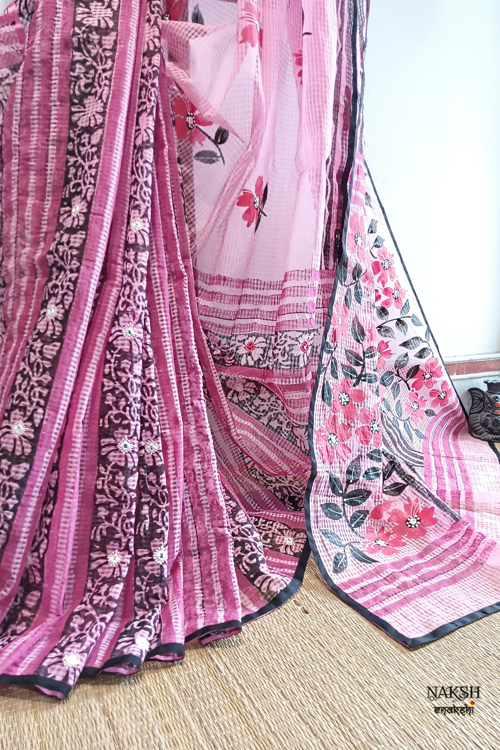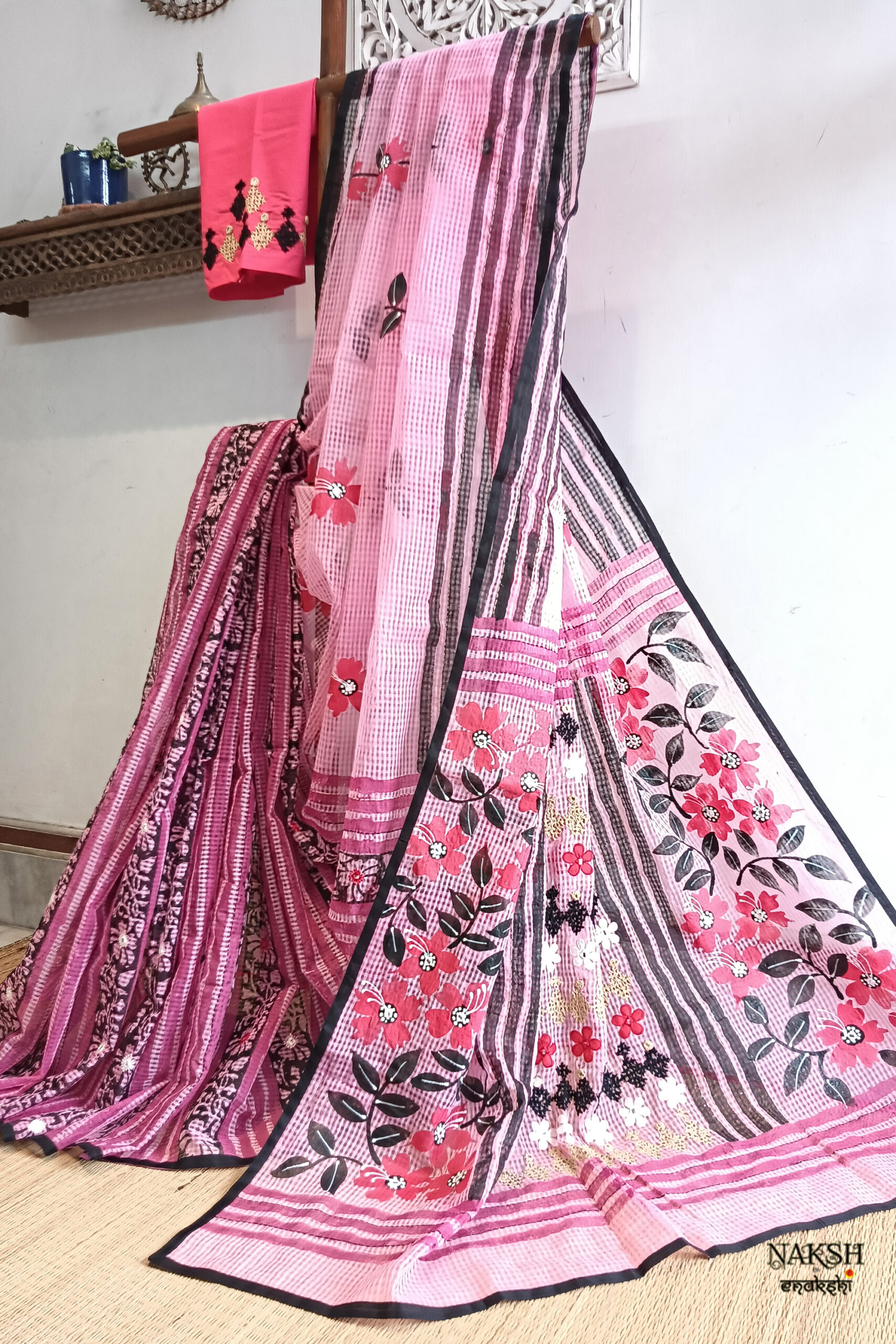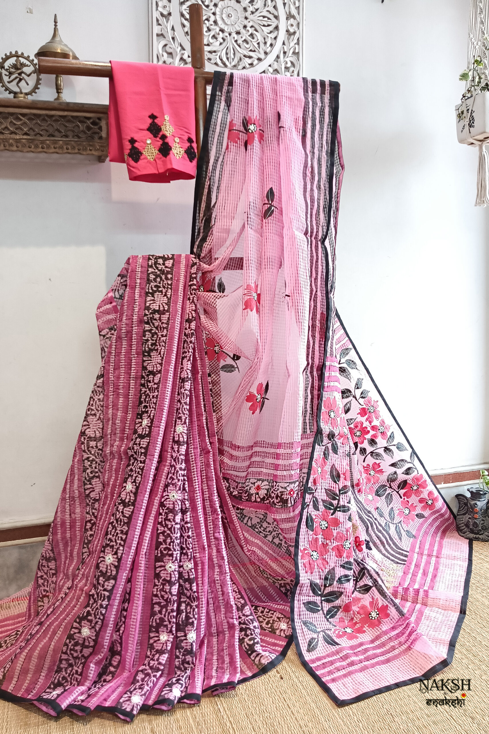 Resham checks the saree with mix-and-match work. This pink resham checks saree is thoughtfully designed with a unique mix-and-match work. The saree is a rare fusion combination of hand blocks, freehand paintings, gujrati hand embroidery, and machine embroidery with applique work.